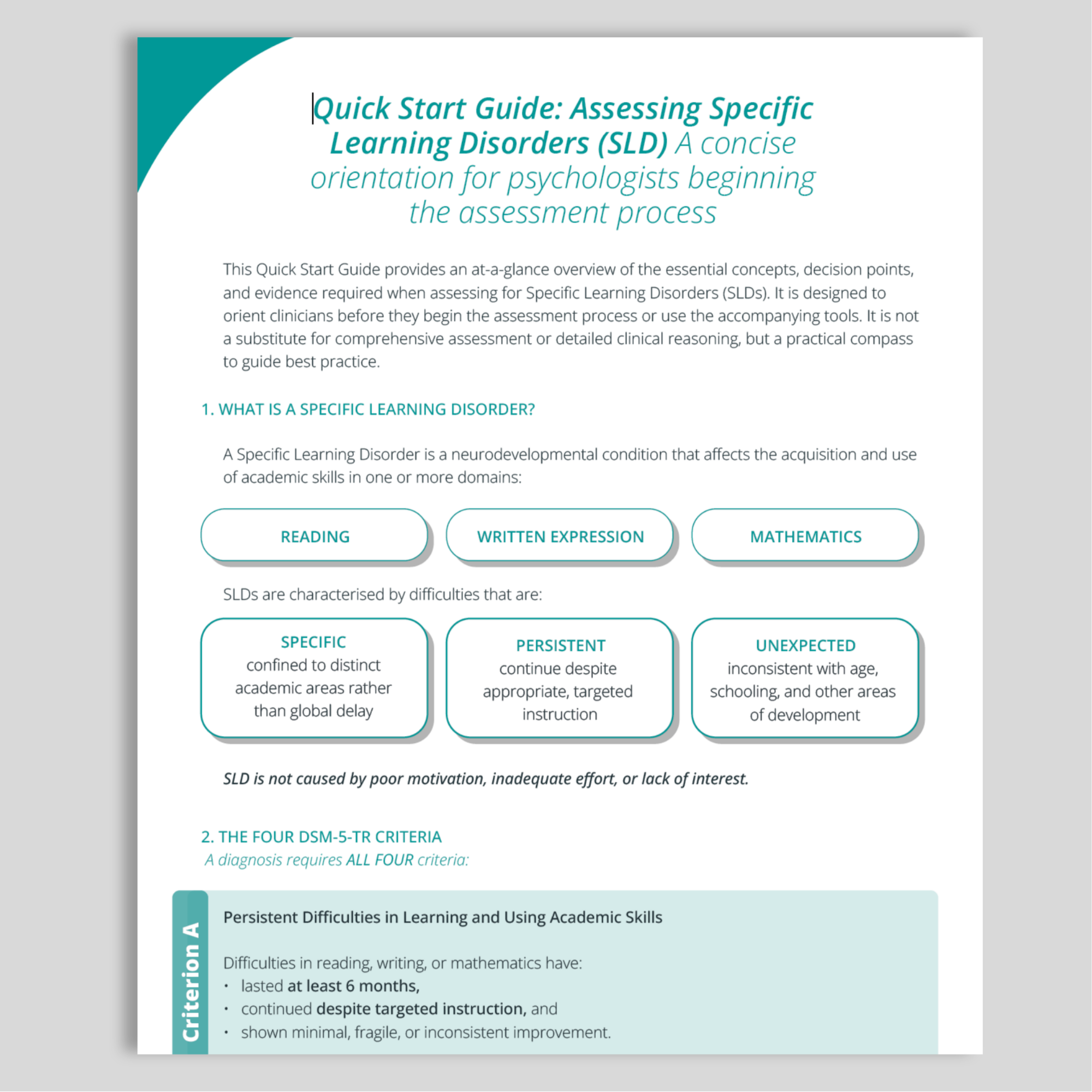 The SLD Assessment Resource Kit grew out of a need for practical tools that help clinicians organise complex assessment information and translate it into meaningful conclusions and recommendations. The aim is to support clarity, consistency, and confidence when working through the many pieces of information that form part of a learning assessment.